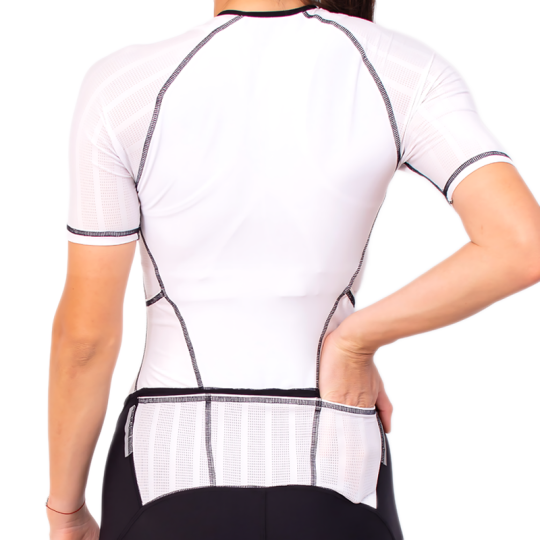 Dos bolsillos traseros integrados permiten el almacenamiento seguro de geles o sales sin generar arrastre aerodinámico.